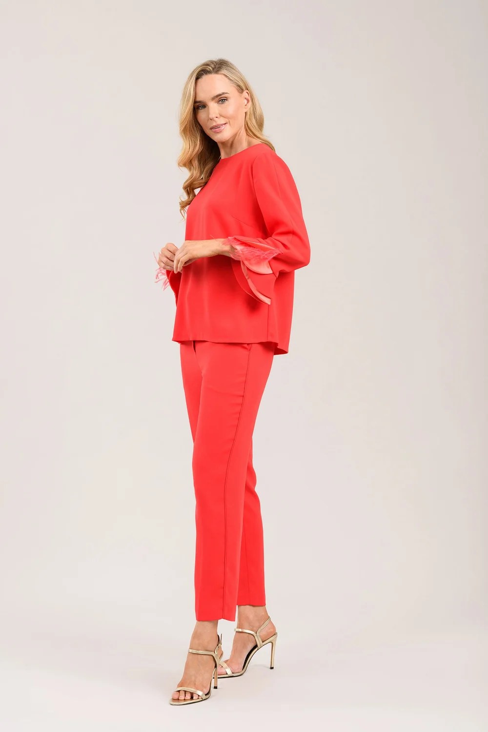 Relaxed fit top with round neckline with button fastening on the back. Finished with a stunning scalloped detailed on the three quarter sleeve. Matching trousers available.